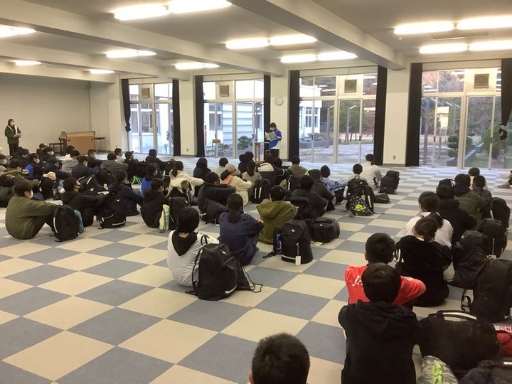 朝、多目的教室で自然文化体験活動の出発式を行いました。少々寒いですが、無事出発しました。